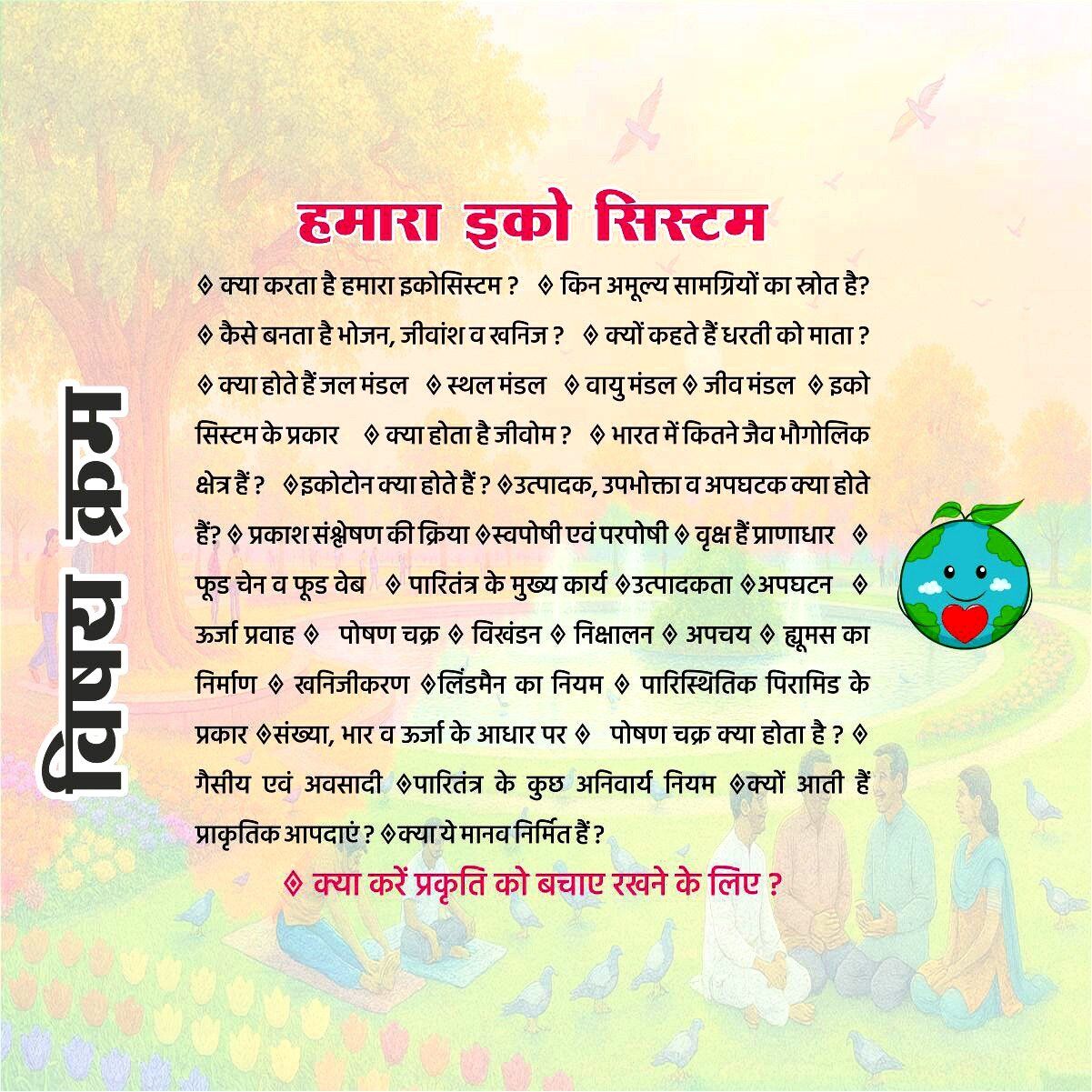 Nature, Dharti Mata, Environment, Pollution, Making Process of Food, Humus, Minerals etc, Natural Disaster, Climate Change, Biodiversity, Ecology, Waste Disposal, Global Warming, Conservation, Deforestation.