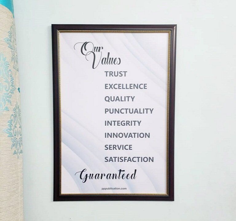 Our Values Wall Frame General Quote, ideal motivational gift for your loved ones. Inspiring quotes and art will liven your space. A motivational photo frame can be a great way to uplift or inspire yourself and others. High quality, sleek and elegant design gives it a sophisticated and timeless look. A great Wall decor for multiple uses like Classrooms, Hospitals, etc public places. Perfectly fit for office and home spaces. There is an inspiring line digitally printed on the sun board. These lines serve as a constant reminder of your goals, dreams, or personal mantra.