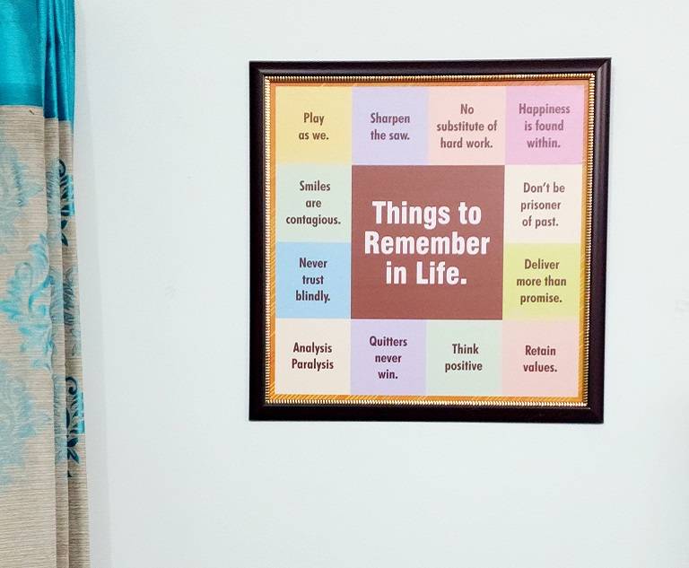 Things to Remember General Wall Frame, gift for your loved ones. Inspiring quotes and art will liven your space. A motivational photo frame can be a great way to uplift or inspire yourself and others. High quality, sleek and elegant design gives it a sophisticated and timeless look. A great Wall decor for multiple use like Class rooms, Hospitals etc public places. Perfectly fit for office and home spaces. There is a inspiring lines digitally printed on sun board. These lines serves as a constant reminder of your goals, dreams or personal mantra.